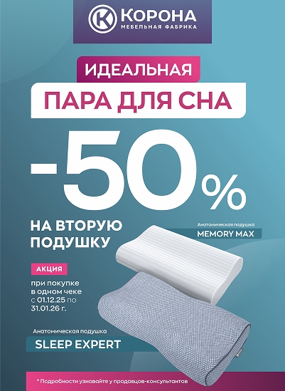 С 1 декабря 2025 года по 31 января 2026 года при покупке двух подушек в одном чеке вы получаете скидку 50% на вторую подушку.